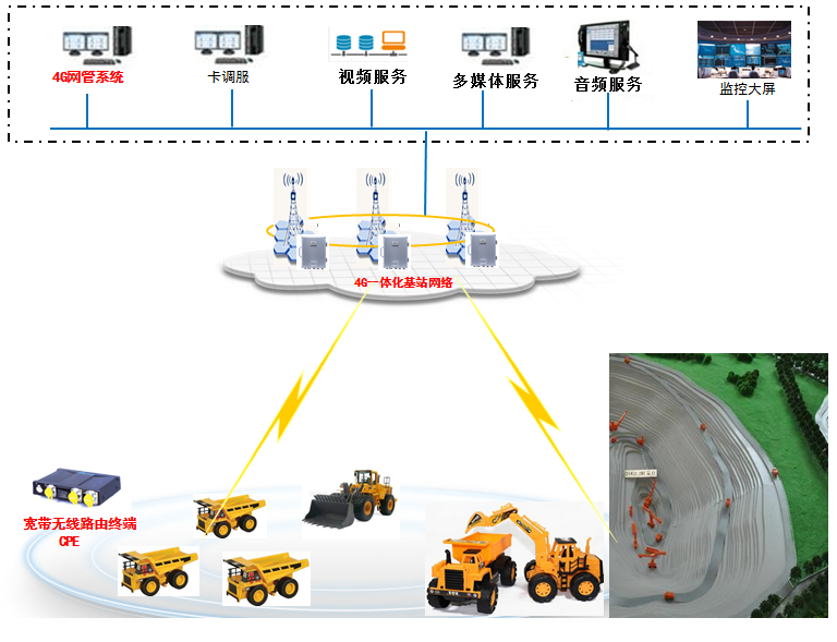 針對城門山露天銅礦的現(xiàn)狀和通訊發(fā)展趨勢,在城門山自建4G LTE 寬帶無線通信基站,實現(xiàn)礦山4G全覆蓋。