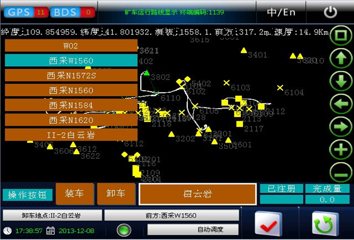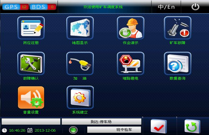 車載終端是安裝在挖機、鉸卡、鉆機及其它輔助車輛等設(shè)備上的專用計算機。由中央微處理機、觸摸屏、顯示屏、衛(wèi)星定位系統(tǒng)、接口系統(tǒng)和電源系統(tǒng)組成。各部分與主體之間采用高強度電纜、航空插件聯(lián)接。車鏟通用的智能終端適應(yīng)工業(yè)現(xiàn)場能力強,對過壓、過流、過熱、欠壓具有自保護功能,還具有防水、防塵、防過熱、抗震等功能。智能終端能夠收發(fā)指令信息,并實時的將現(xiàn)場的生產(chǎn)情況和設(shè)備狀況傳遞到總控系統(tǒng)。智能終端系統(tǒng)采用觸摸屏控制,界面清晰明了,操作簡單。
